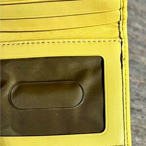 Elegant Coach card holder with signature pattern. Bright yellow design for a chic look. Size 3 x 4.5 inches. In excellent condition no rip or tear. Notice minimal wearing off on the inside on the right. Rarely used. No box.