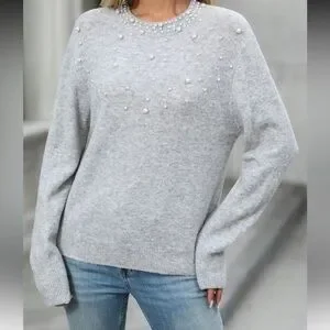New Gray Sweater with Pearl Embellishments