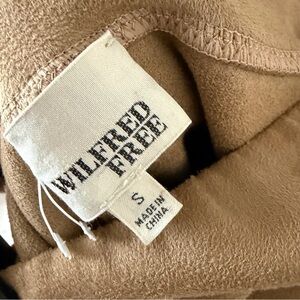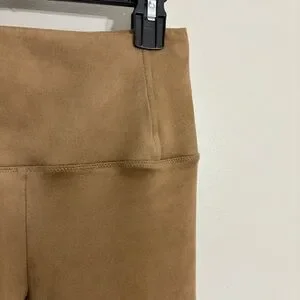 Aritzia Wilfred Free Daria tan faux vegan suede legging. These are high-rise leggings with a wide waistband. This version of the Daria are made with vegan suede fabric. Richly Textured