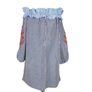 Romeo & Juliet Couture Blouse S Blue Striped Embroidered Sleeve Off Shou…
