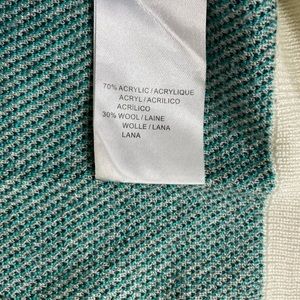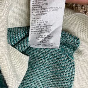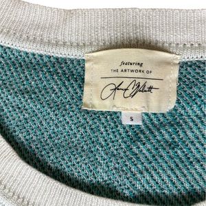 Absolutely precious knit pullover sweater with textured llama motif on front in ecru, pink, peach, gray, blue and teal. Turquoise, teal, aqua and ecru watercolor graphic motif throughout reminder. Neck, sleeves and hem trimmed in ecru.
