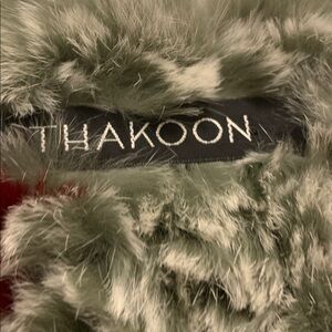 Bold red and gray design. Textured knit for a unique look. Perfect for layering. Has tear in armpit of jacket. This was a 700 dollar coat. Maybe someone that sews well can repair it. Look at all the pictures!