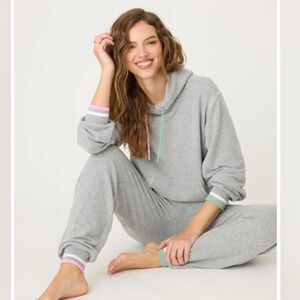 Get cozy in this matching grey hoodie and jogger set with pink and green contrast cords and striped cuffs. Perfect for lounging in style.