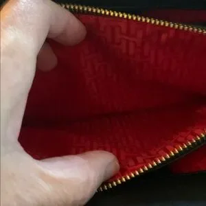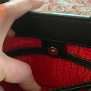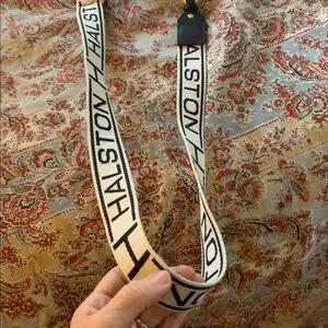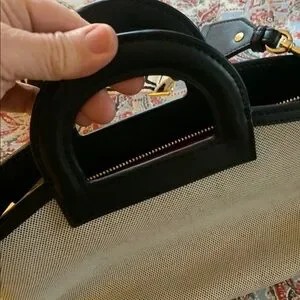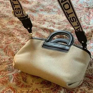 Elegant crossbody bag with a black handle and tan body. Features a bold strap with brand detail. Ideal for everyday use.