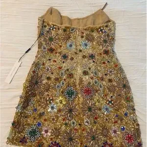 Shine in this elegant gold dress adorned with colorful floral embellishments. Perfect for special occasions.
