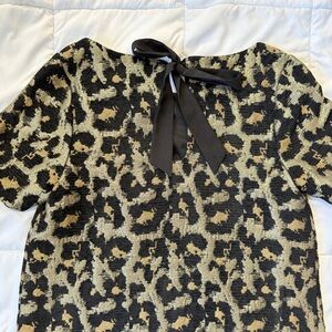 Turn heads with this luxe leopard-print jacquard top from Hutch for Anthropologie. Woven with subtle gold metallic threads, this chic statement piece features a structured silhouette, short sleeves, and a dramatic black satin tie-back neckline. Perfect for holidays, parties, or elevating your date-night look.