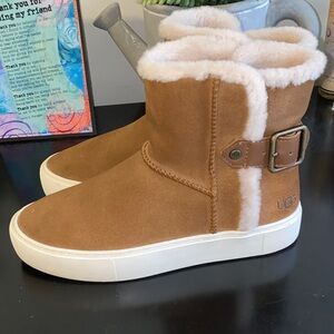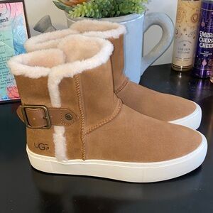 Stylish UGG boots with shearling lining. Features a buckle detail. Comfortable and warm.