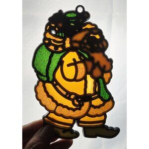 This product is a set of 4 vintage Christmas holiday stained glass sun catchers ornaments, featuring a Santa Claus & others theme in a cottage core style. Each ornament is 5 inches in height and made of glass and metal, showcasing a multicolor design with a hanging decorative feature. Manufactured in the 1980s in the United States, these novelty ornaments are part of a holiday collection and add a festive touch to Christmas decorations. Perfect for collectors or those seeking unique and charming additions to their holiday decor.