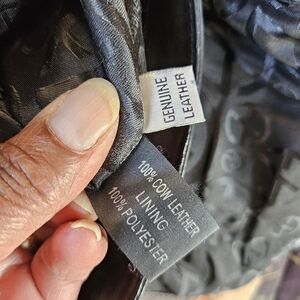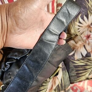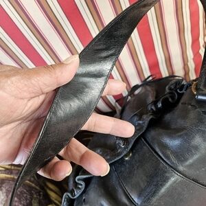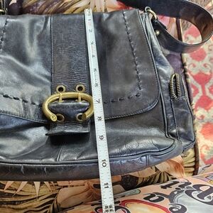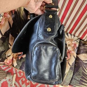 Francesco Biasia Black Patent Leather Shoulder Bag. Flap-over side snap closure. Exterior side zipper pouches. Drawstring back deep compartment with snap closure. Stitch detail around flap. Interior deep side zipper pocket.