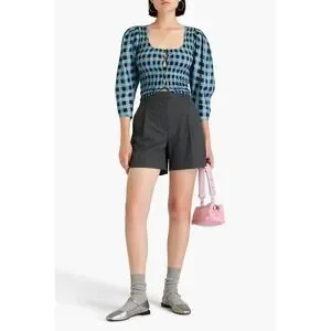 A chic and stylish smocked top from Ganni, featuring a square neckline and a button-up front. This blouse showcases a unique checkered pattern in Alaskan Blue and black, complemented by distinctive puff sleeves. The smocked bodice provides a flattering and comfortable fit, making it a versatile addition to any wardrobe. With its blend of modern design and classic elements, this Ganni top is perfect for adding a touch of sophistication to your everyday look.