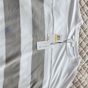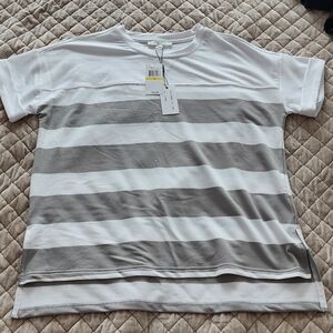 Stylish short sleeve tee with classic white and gray stripes. Perfect for casual wear. Soft fabric for comfort.
