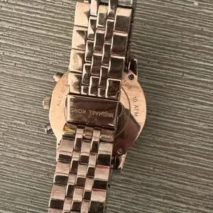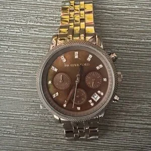 Stylish Michael Kors watch with a gold-tone band. Brown dial with crystal markers. Chronograph features. NEEDS NEW BATTERY