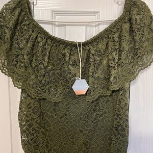Pinkblush maternity olive green lace dress with an off-shoulder design. Never been worn/New with tags!