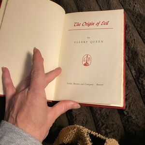 Red hardcover book titled 'The Origin of Evil' by Ellery Queen. 1951