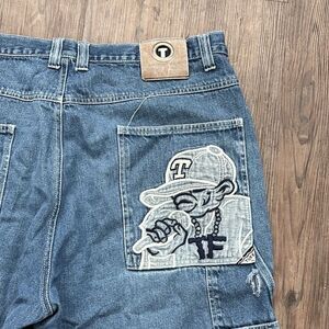 VINTAGE Y2K TUFF EMBROIDERED RAPPER DENIM CARGO SHORTS MENS 38