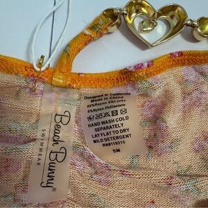 Add a flirty, luxe touch to your swimwear or summer wardrobe with this brand new Beach Bunny “Saddie” mini skirt in size Small. Features a vibrant orange floral print with pink blossoms and an eye-catching gold heart chain waistband. Designed to pair with Beach Bunny swim or worn as a statement piece on its own.