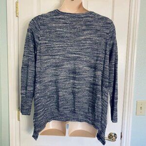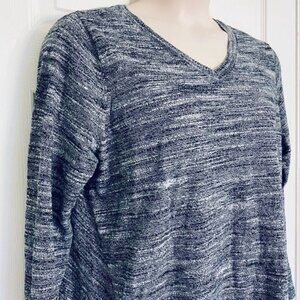 LOGO by Lori Goldstein sweater shark bite hem. In good used condition !! Like new !! Gray white and black heather. SIze tag cut out. Measures to be a XXL or XL . 46" chest and 28" length