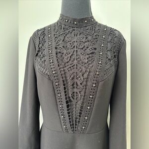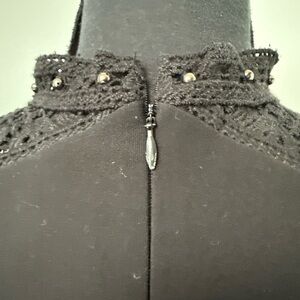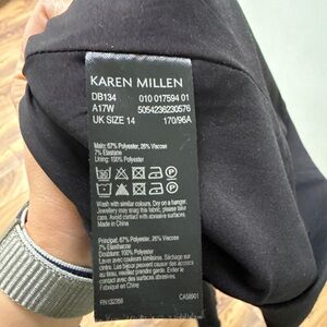 This elegant black dress by Karen Millen is designed with a sophisticated mock neck and 3/4 bell sleeves, making it ideal for a night out. The A-line silhouette offers a flattering fit, while the Mandarin collar adds a refined touch to the overall look.