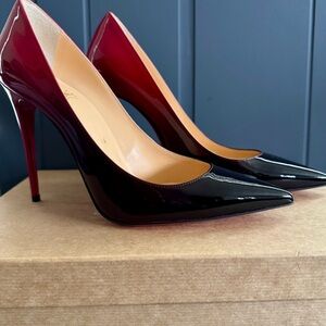 Chic and stylish brand favorite the iconic Kate 100 mm Pumps. Patent calf leather. Instantly recognized by its signature red lacquered sole, this pair is reworked by the French fashion house in a patent dégradé (black red gradient). Never worn. New in box. Comes with dust bag. Runs small. Size up half a size.