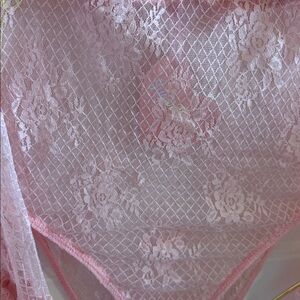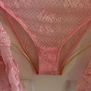 NWT! Sold out in site. Never worn before! This bodysuit has a stretchy sheer lace construction, a lined bust, long bell sleeves with ruffled details, fabric rosette appliques, a sweetheart neckline, and a snap button crotch closure.