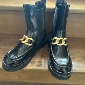 Stylish black boots featuring a bold gold chain accent. Perfect for adding a touch of elegance to any outfit. Brand new condition