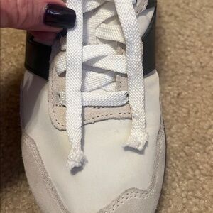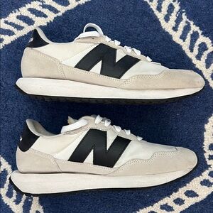 Elevate your look with these New Balance 237 sneakers. Size W8.5 Beige and black design. Not new but, very good condition. Sole and toes have very little wear. One tiny spot on front right top. Tips of shoe laces are missing.See last photo. Very clean.