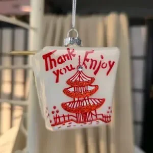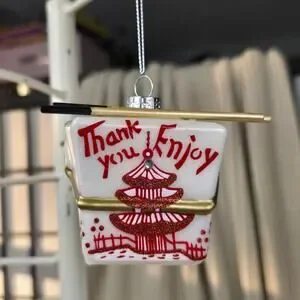 Chinese Take Out Box with Chopsticks Blown Glass Christmas Ornament Foodie