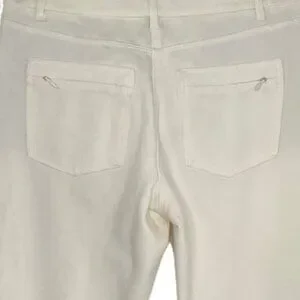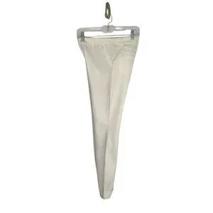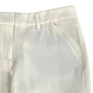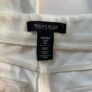 This White House Black Market Skinny Leg Stretch Pants in white, size OR/XS is made of nylon, spandex, and rayon knit fabric with a flat front. They feature zipper front and back pockets, button accents, and a slim fit. The pants have a 27-inch inseam and a 28-inch waist size. Ideal for casual occasions in winter, summer, fall, and spring. Machine washable. MATERIAL CONTENT: 68% Rayon, 28% Nylon, 4% Spandex. MEASUREMENTS: 36" Length, 28" Waist, 9" Rise, 27" Inseam, 10" Leg Holes.