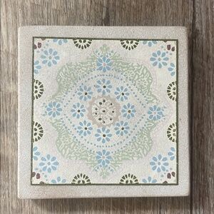 Gently loved bohemian style soapstone coaster set with wooden holding rack. Set of four coasters with a cute bohemian design