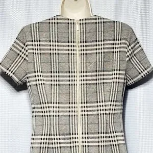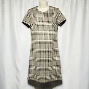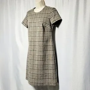 Highlights: classic plaid sheath dress with a bit of stretch, front and back darts for that tailored look, short sleeves, round neckline, and a gold back zipper.