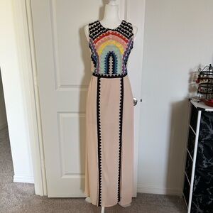 New without tags C Luce rainbow geometric embroidered maxi dress. Size small. Fits a size 4 well. I am a size 6 and it is a little too tight for me. Mannequin is a size 4 and fits perfectly. Cream color with rainbow color embroidery. Two slits up front of skirt. Hidden side zipper. Has lining in top and lining in bottom is mini skirt length. So not see through. Bought and never wore and now too small. Please feel free to ask any questions at all. I am 5 star seller and Posh ambassador. Smoke free home. Thanks