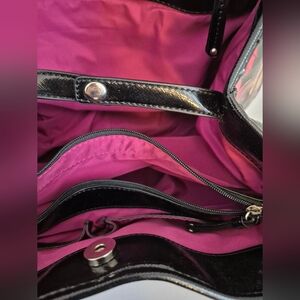 Vibrant floral design on a sleek black background, stunning for any occasion. Purple, magenta, tan hues. Lots of compartments for your essentials. Interior is a bold pink.