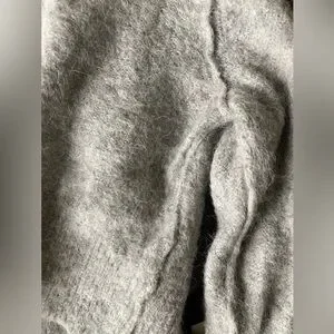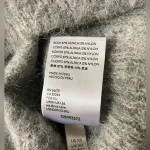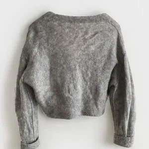So light and fluffy yet warm! Super soft knit, not scratchy. The perfect layering piece for your winter wardrobe. Fit is relaxed, length is slightly cropped. Size XS but could also fit a small, or possibly medium if you want a more fitted look. It’s got a bit of stretch to it.