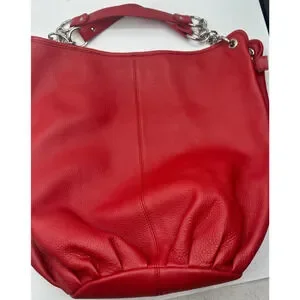 The Auth. BODHI Red Leather Chain Handbag is a stylish and versatile accessory for women. With a soft zip top and multiple pockets, this medium-sized cylinder-shaped bag in bright red leather is perfect for everyday use. The red top handle and golden hardware accents add a touch of designer flair, while the chain strap provides both style and convenience. Made of high-quality leather with a pebbled finish, this handbag from the BODHI collection is a must-have for those who appreciate both fashion and functionality.