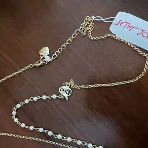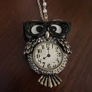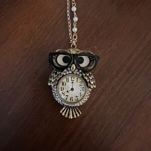 whimsical owl pendant necklace by fashion designer Betsey Johnson as part of her "Back to Cool" collection. The piece features a stylized owl with rhinestone accents, black glasses, and a clock face (not a real working watch) integrated into the owl's body, suspended on a chain with faux pearl accents. Adjustable chain , brand new with tag.
