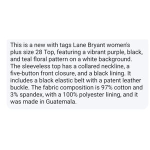 Elevate your wardrobe with the NWT Lane Bryant Plus Size 28 Purple Floral Top, designed to flatter and empower. The vibrant floral pattern brings a touch of nature's beauty, while the included belt cinches your waist, creating a stunning silhouette. This versatile top is perfect for both casual outings and special occasions, ensuring you feel confident no matter where you go. Made from soft, breathable fabric, it provides all-day comfort without compromising style. Plus, its easy-care material means less time worrying about laundry and more time enjoying life. This top is not just a piece of clothing; it's an expression of your unique style. Don’t miss out on this essential addition to your collection—grab yours today before it's gone!