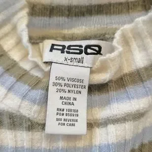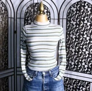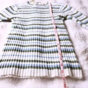 Cozy striped knit sweater with green, blue, and white colors. Perfect for casual wear.