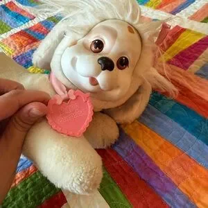 Charming Hasbro plush dog family. Includes large cream dog and five small puppies in black, white, and cream. The puppies fit inside the mom’s belly. Ideal for kids and collectors.