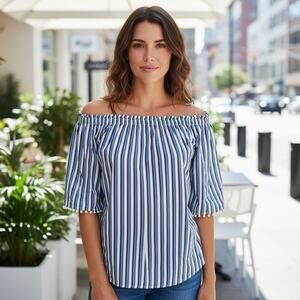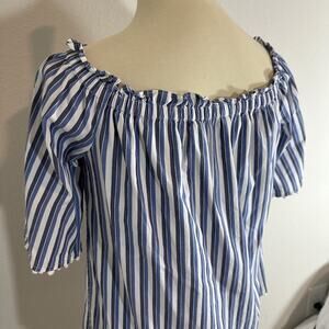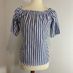Trina Turk Small Top Sleeveless Blouse Blue Striped Preppy Coastal Poms Coastal