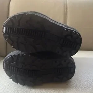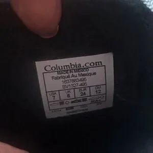 Columbia kids' winter boots with light blue and black design. Lined. Features colorful mountain patterns. Ideal for winter fun. No tags but never worn.