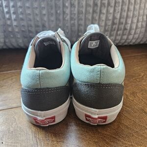 Vans sneakers in mint and charcoal. Features white laces and tan stripe. Casual and trendy. Excellent condition small pen stain on the side of right shoe barely noticeable and make possibly wash out if tried