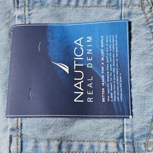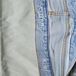 Experience comfort with Nautica's authentic loose jeans. Light blue for a versatile style, some distressed at the hip and pocket. They have some discoloration as pictured on the back. I'm not sure if it is intentional or if it is just dust from the warehouse.