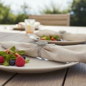 Set of silver flower-shaped napkin rings. Perfect for adding elegance to your table setting.