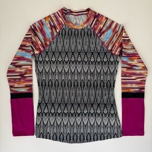 Vibrant prAna activewear set featuring a long sleeve crew neck top and matching capri leggings with adjustable waist and zip pocket. Bold geometric ikat print adds color and energy to your workout or weekend wear. Excellent used condition from a smoke-free home. Sustainable, stylish, and perfect for yoga, travel, or errands. Ships same or next day for fast delivery.