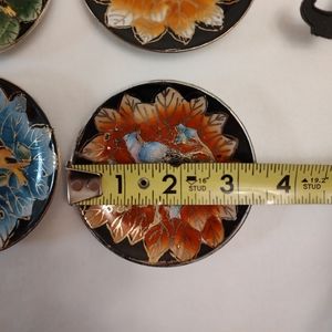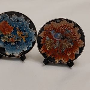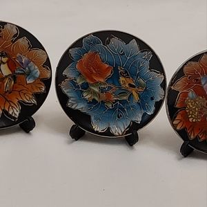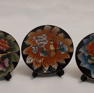 Vintage bundle of four little decorative plates that were hand painted in china. The plates measure a little over 3 in, and each one comes with foldable plastic stands that have a strap snap to secure into place, making them easy to store and transport.