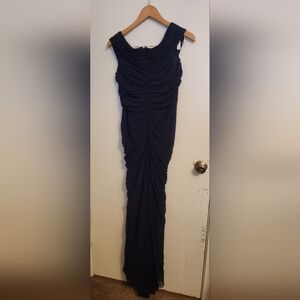 Chic navy gown with ruched detailing. Perfect for formal occasions.