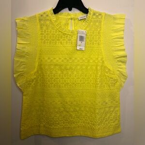 Chic yellow blouse with intricate embroidered design. Features stylish ruffled flutter sleeves and a keyhole opening at the back. NWT. Original price: $80.
