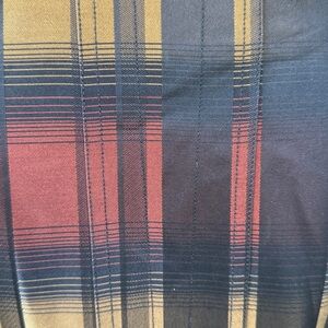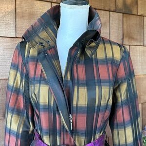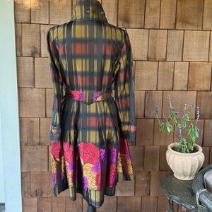 Classic bubble dress Trench coat black and bronze plaid with vibrant gem tone flower details at helm and belt. Signature collar and pockets. Belt. WATER RESISTANT; fully lined, zipper front, two pockets.