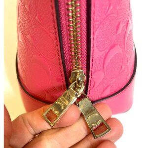This stylish Coach Sierra handbag in debossed patent leather combines elegance with functionality. Its vibrant Dahlia pink color and spacious design make it a standout accessory.