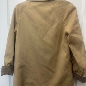 Chic Calvin Klein trench coat in camel. Features button closure and front pockets. Ideal for petite women.